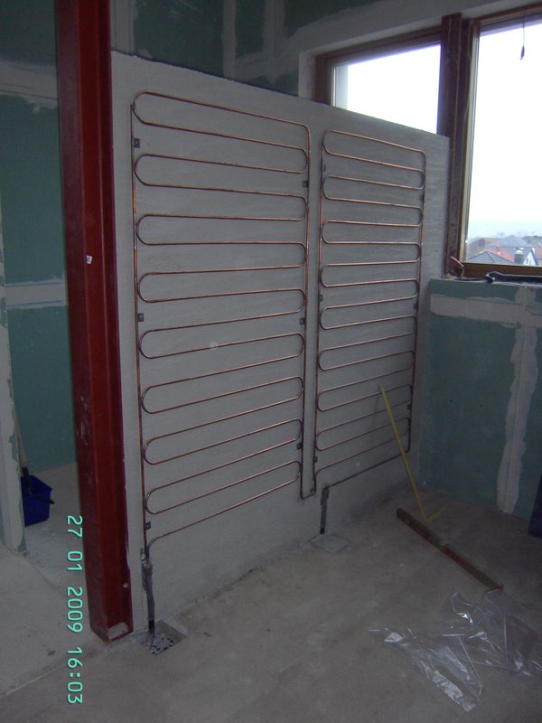 Die Heizungsanlage besteht aus einer Sole-Wasser-Wärmepumpe mit Erdsondenbohrung sowie Fußboden- und Wandheizungen.